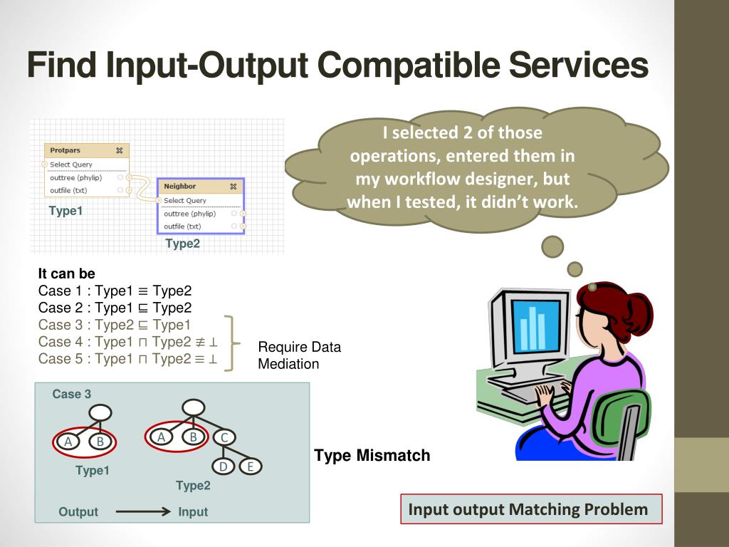 Find Input-Output Compatible Services I selected 2 of those operations, entered them in my workflow designer, but when I tested, it didn’t work. Type1 Type2 It can be Case 1 : Type1 Type2 Case 2 : Type1 Type2 Case 3 : Type2 Type1 Case 4 : Type1 Type2 Case 5 : Type1 Type2 Require Data Mediation Case 3 Type Mismatch A B C A B Type1 D E Type2 Input output Matching Problem Input Output