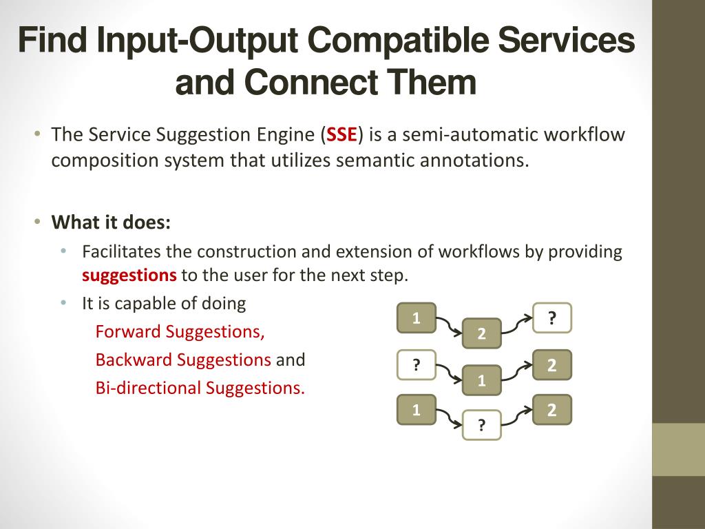 Find Input-Output Compatible Services and Connect Them • The Service Suggestion Engine (SSE) is a semi-automatic workflow composition system that utilizes semantic annotations. • What it does: • Facilitates the construction and extension of workflows by providing suggestions to the user for the next step. • It is capable of doing Forward Suggestions, Backward Suggestions and Bi-directional Suggestions. 1 ? 1 ? 2 2 2 1 ?
