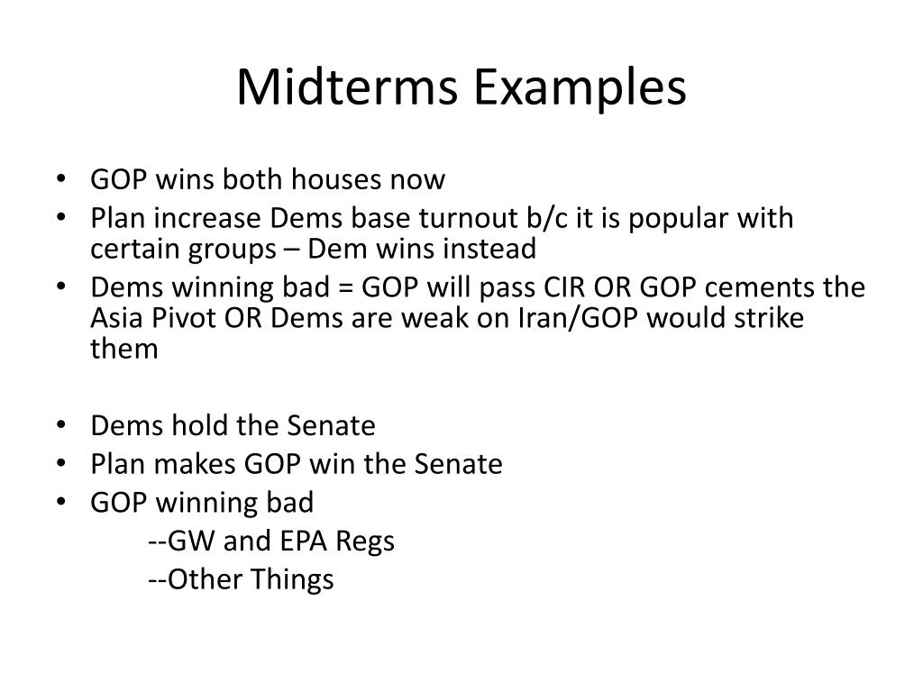 Midterms Examples • GOP wins both houses now • Plan increase Dems base turnout b/c it is popular with certain groups – Dem wins instead • Dems winning bad = GOP will pass CIR OR GOP cements the Asia Pivot OR Dems are weak on Iran/GOP would strike them • Dems hold the Senate • Plan makes GOP win the Senate • GOP winning bad --GW and EPA Regs --Other Things