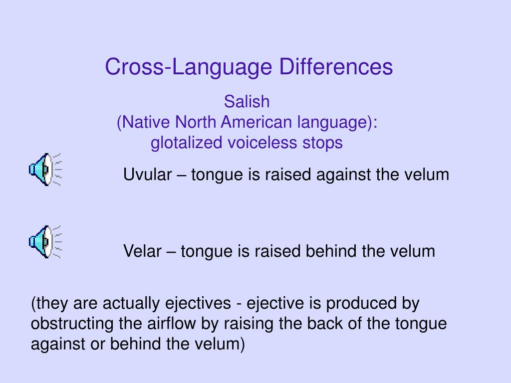 Cross-Language Differences Salish (Native North American language): glotalized voiceless stops Uvular – tongue is raised against the velum Velar – tongue is raised behind the velum (they are actually ejectives - ejective is produced by obstructing the airflow by raising the back of the tongue against or behind the velum)