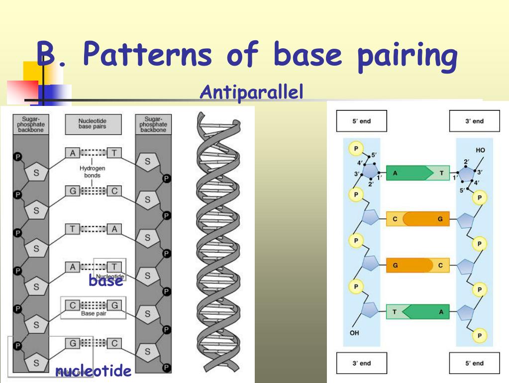 B. Patterns of base pairing Antiparallel base nucleotide