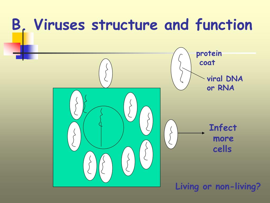 B. Viruses structure and function protein coat viral DNA or RNA Infect more cells Living or non-living?