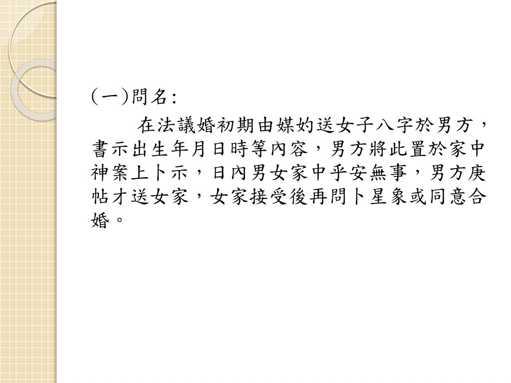 (一)問名: 在法議婚初期由媒妁送女子八字於男方,書示出生年月日時等內容,男方將此置於家中神案上卜示,日內男女家中乎安無事,男方庚帖才送女家,女家接受後再問卜星象或同意合婚。