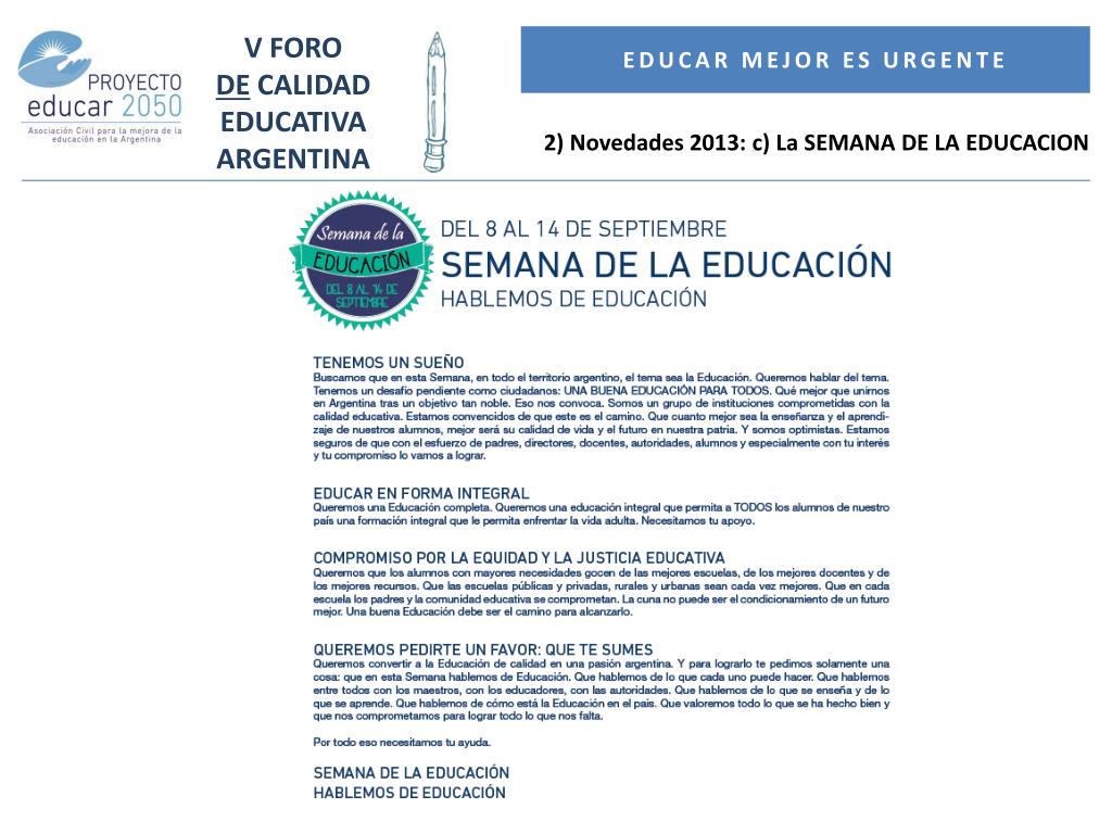 V FORO DE CALIDAD EDUCATIVA ARGENTINA Educar mejor es URGENTE 2) Novedades 2013: c) La SEMANA DE LA EDUCACION