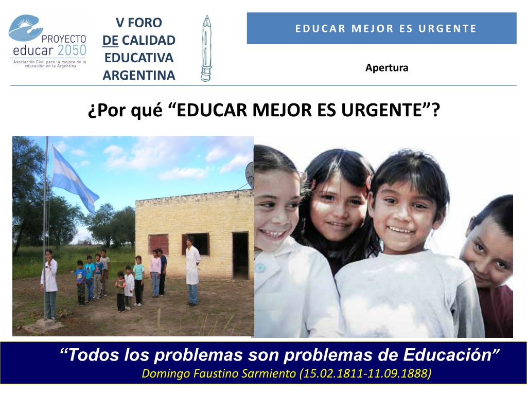 V FORO DE CALIDAD EDUCATIVA ARGENTINA Educar mejor es URGENTE Apertura ¿Por qué “EDUCAR MEJOR ES URGENTE”? • “Todos los problemas son problemas de Educación” Domingo Faustino Sarmiento (15.02.1811-11.09.1888)