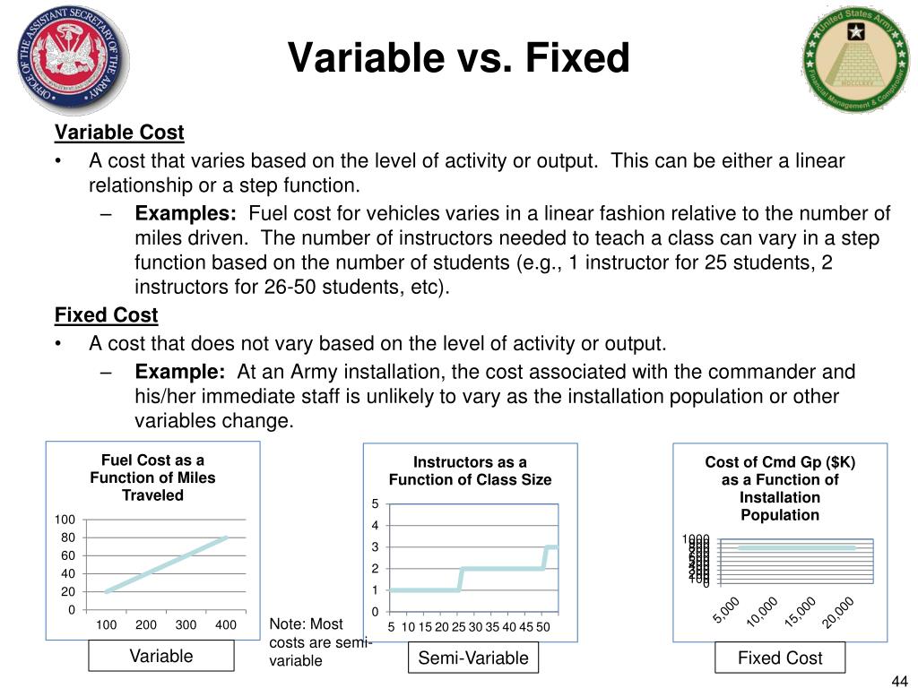 Variable vs. Fixed Variable Cost • A cost that varies based on the level of activity or output. This can be either a linear relationship or a step function. • Examples: Fuel cost for vehicles varies in a linear fashion relative to the number of miles driven. The number of instructors needed to teach a class can vary in a step function based on the number of students (e.g., 1 instructor for 25 students, 2 instructors for 26-50 students, etc). Fixed Cost • A cost that does not vary based on the level of activity or output. • Example: At an Army installation, the cost associated with the commander and his/her immediate staff is unlikely to vary as the installation population or other variables change. Note: Most costs are semi-variable Variable Semi-Variable Fixed Cost 44