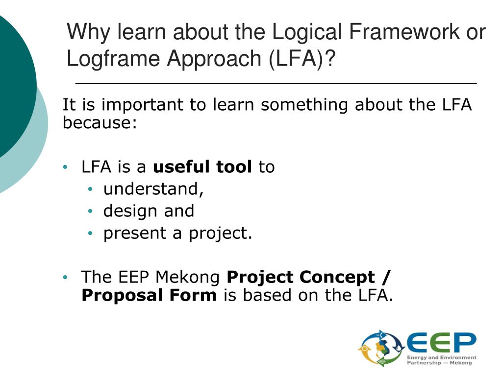Why learn about the Logical Framework or Logframe Approach (LFA)? It is important to learn something about the LFA because: • LFA is a useful tool to • understand, • design and • present a project. • The EEP Mekong Project Concept / Proposal Form is based on the LFA.