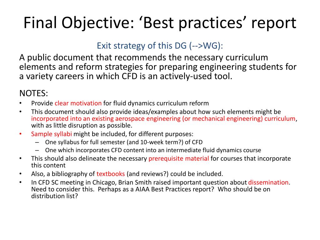 Final Objective: ‘Best practices’ report Exit strategy of this DG (-->WG): A public document that recommends the necessary curriculum elements and reform strategies for preparing engineering students for a variety careers in which CFD is an actively-used tool. NOTES: • Provide clear motivation for fluid dynamics curriculum reform • This document should also provide ideas/examples about how such elements might be incorporated into an existing aerospace engineering (or mechanical engineering) curriculum, with as little disruption as possible. • Sample syllabi might be included, for different purposes: • One syllabus for full semester (and 10-week term?) of CFD • One which incorporates CFD content into an intermediate fluid dynamics course • This should also delineate the necessary prerequisite material for courses that incorporate this content • Also, a bibliography of textbooks (and reviews?) could be included. • In CFD SC meeting in Chicago, Brian Smith raised important question about dissemination. Need to consider this. Perhaps as a AIAA Best Practices report? Who should be on distribution list?
