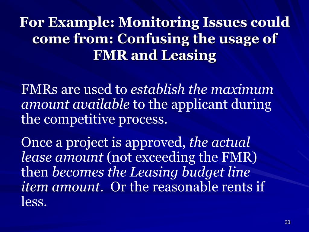 For Example: Monitoring Issues could come from: Confusing the usage of FMR and Leasing FMRs are used to establishthe maximum amount available to the applicant during the competitive process. Once a project is approved, the actual lease amount (not exceeding the FMR) then becomes the Leasing budget line item amount. Or the reasonable rents if less.