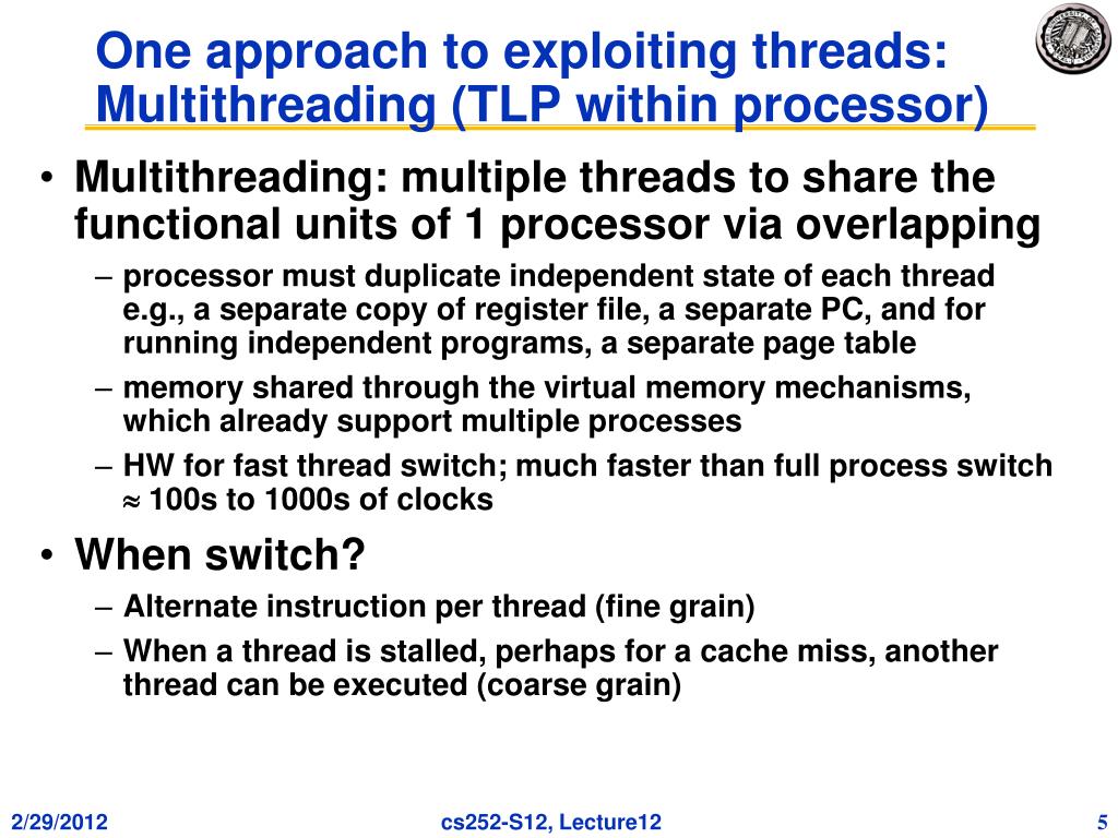 One approach to exploiting threads: Multithreading (TLP within processor) • Multithreading: multiple threads to share the functional units of 1 processor via overlapping • processor must duplicate independent state of each thread e.g., a separate copy of register file, a separate PC, and for running independent programs, a separate page table • memory shared through the virtual memory mechanisms, which already support multiple processes • HW for fast thread switch; much faster than full process switch 100s to 1000s of clocks • When switch? • Alternate instruction per thread (fine grain) • When a thread is stalled, perhaps for a cache miss, another thread can be executed (coarse grain)