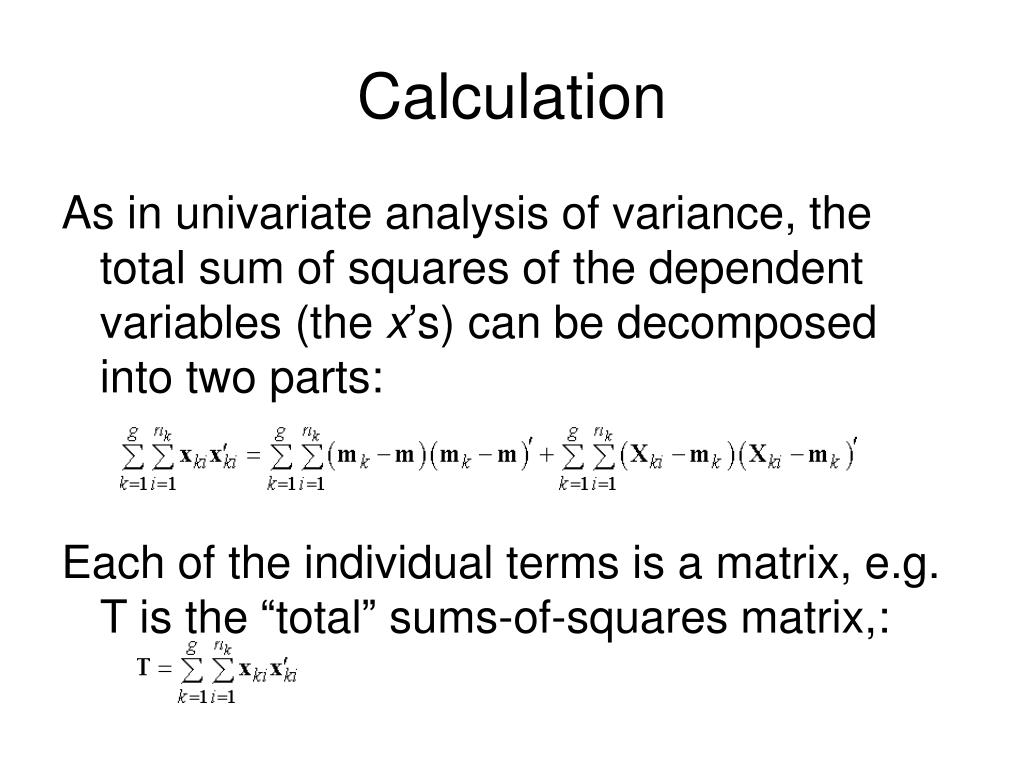 Calculation As in univariate analysis of variance, the total sum of squares of the dependent variables (the x’s) can be decomposed into two parts: Each of the individual terms is a matrix, e.g. T is the “total” sums-of-squares matrix,:
