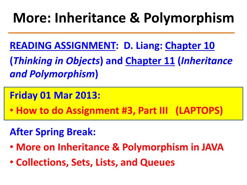 More: Inheritance & Polymorphism • READING ASSIGNMENT: D. Liang: Chapter 10 • (Thinking in Objects) and Chapter 11 (Inheritance and Polymorphism) • Friday 01 Mar 2013: • How to do Assignment #3, Part III (LAPTOPS) • After Spring Break: • More on Inheritance & Polymorphism in JAVA • Collections, Sets, Lists, and Queues