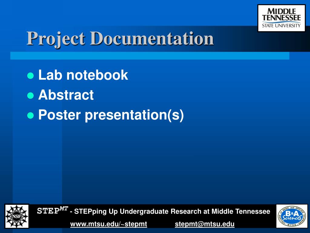 Project Documentation • Lab notebook • Abstract • Poster presentation(s)