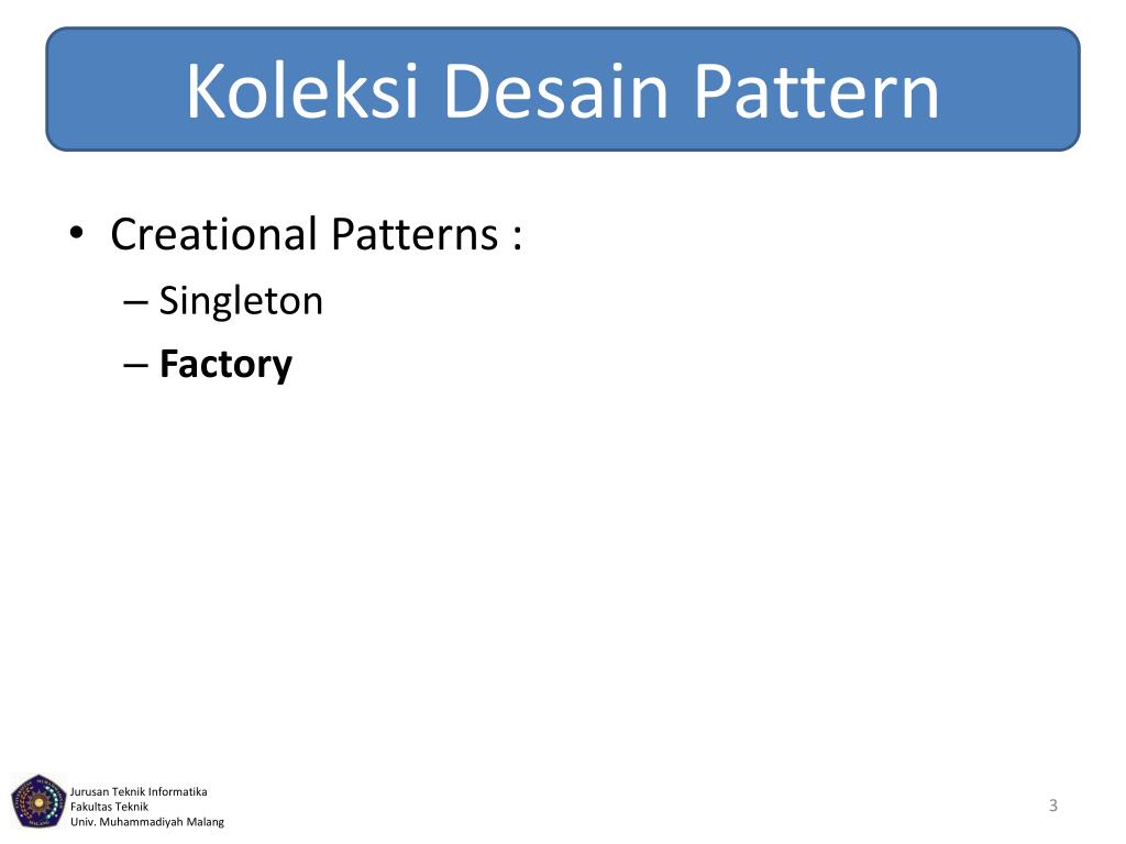 KoleksiDesain Pattern • Creational Patterns : • Singleton • Factory