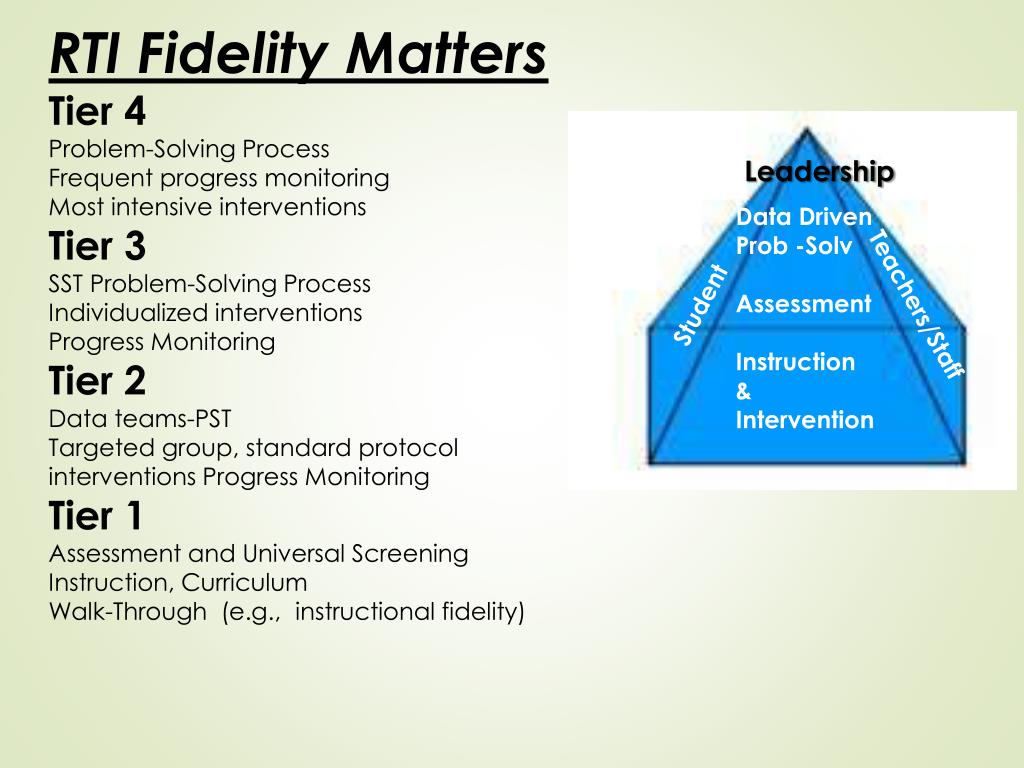 RTI Fidelity Matters Tier 4 Problem-Solving Process Frequent progress monitoring Most intensive interventions Tier 3 SST Problem-Solving Process Individualized interventions Progress Monitoring Tier 2 Data teams-PST Targeted group, standard protocol interventions Progress Monitoring Tier 1 Assessment and Universal Screening Instruction, Curriculum Walk-Through (e.g., instructional fidelity) Leadership Data Driven Prob -Solv Assessment Instruction & Intervention Student Teachers/Staff