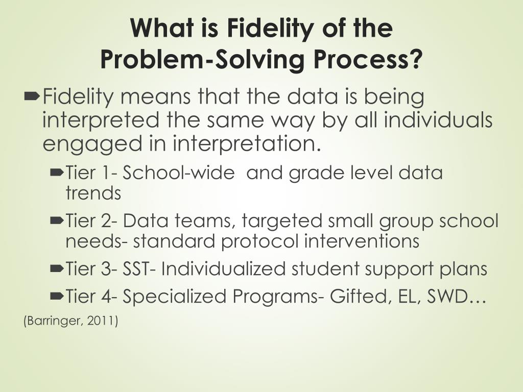 What is Fidelity of the Problem-Solving Process? • Fidelity means that the data is being interpreted the same way by all individuals engaged in interpretation. • Tier 1- School-wide and grade level data trends • Tier 2- Data teams, targeted small group school needs- standard protocol interventions • Tier 3- SST- Individualized student support plans • Tier 4- Specialized Programs- Gifted, EL, SWD… (Barringer, 2011)