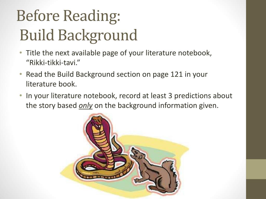 Before Reading: Build Background • Title the next available page of your literature notebook, “Rikki-tikki-tavi.” • Read the Build Background section on page 121 in your literature book. • In your literature notebook, record at least 3 predictions about the story based only on the background information given.