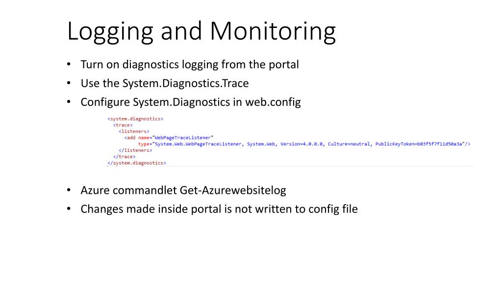 Logging and Monitoring Turn on diagnostics logging from the portal Use the System.Diagnostics.Trace Configure System.Diagnostics in web.config Azure commandlet Get-Azurewebsitelog Changes made inside portal is not written to config file