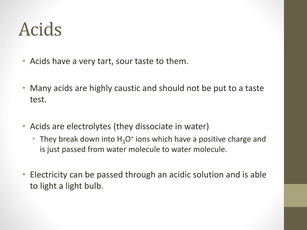 Acids • Acids have a very tart, sour taste to them. • Many acids are highly caustic and should not be put to a taste test. • Acids are electrolytes (they dissociate in water) • They break down into H3O+ ions which have a positive charge and is just passed from water molecule to water molecule. • Electricity can be passed through an acidic solution and is able to light a light bulb.