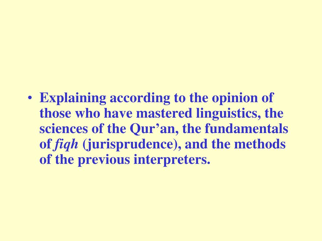 Explaining according to the opinion of those who have mastered linguistics, the sciences of the Qur’an, the fundamentals of fiqh (jurisprudence), and the methods of the previous interpreters.