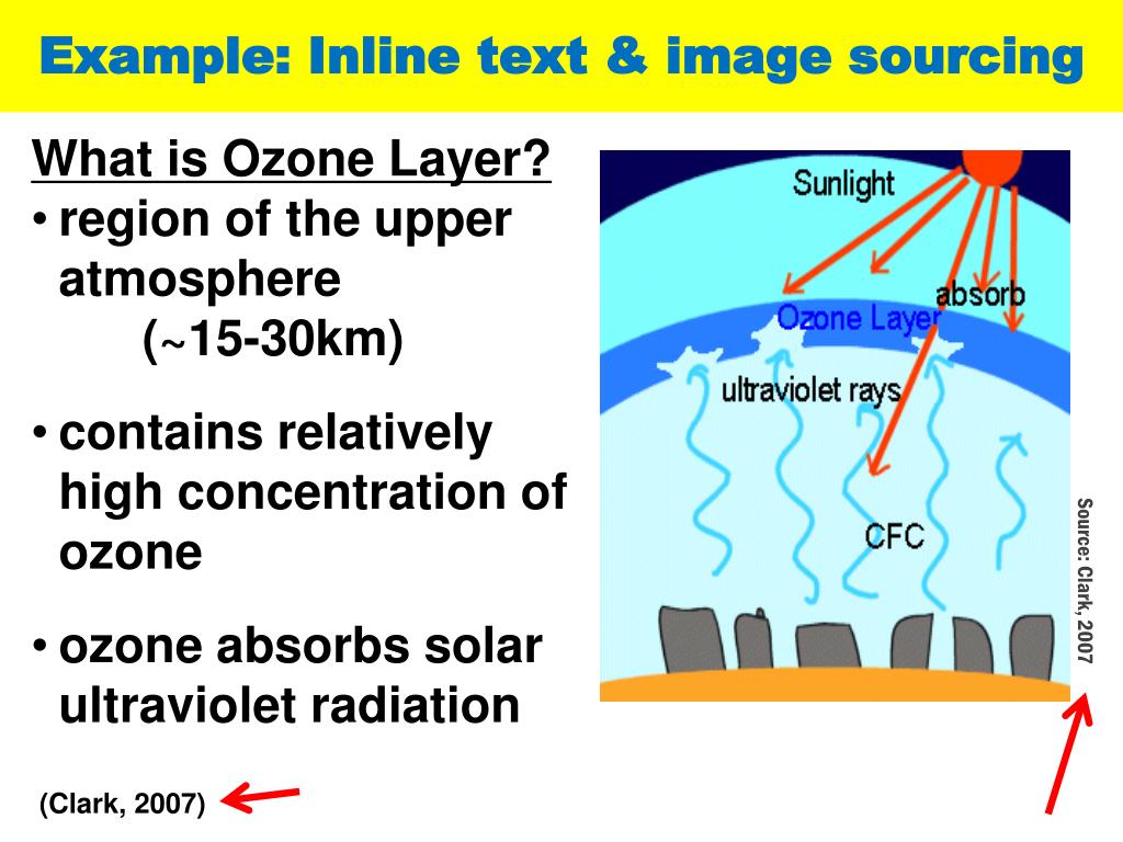 Example: Inline text & image sourcing • What is Ozone Layer? • region of the upper atmosphere (~15-30km) • contains relatively high concentration of ozone • ozone absorbs solar ultraviolet radiation Source: Clark, 2007 (Clark, 2007)