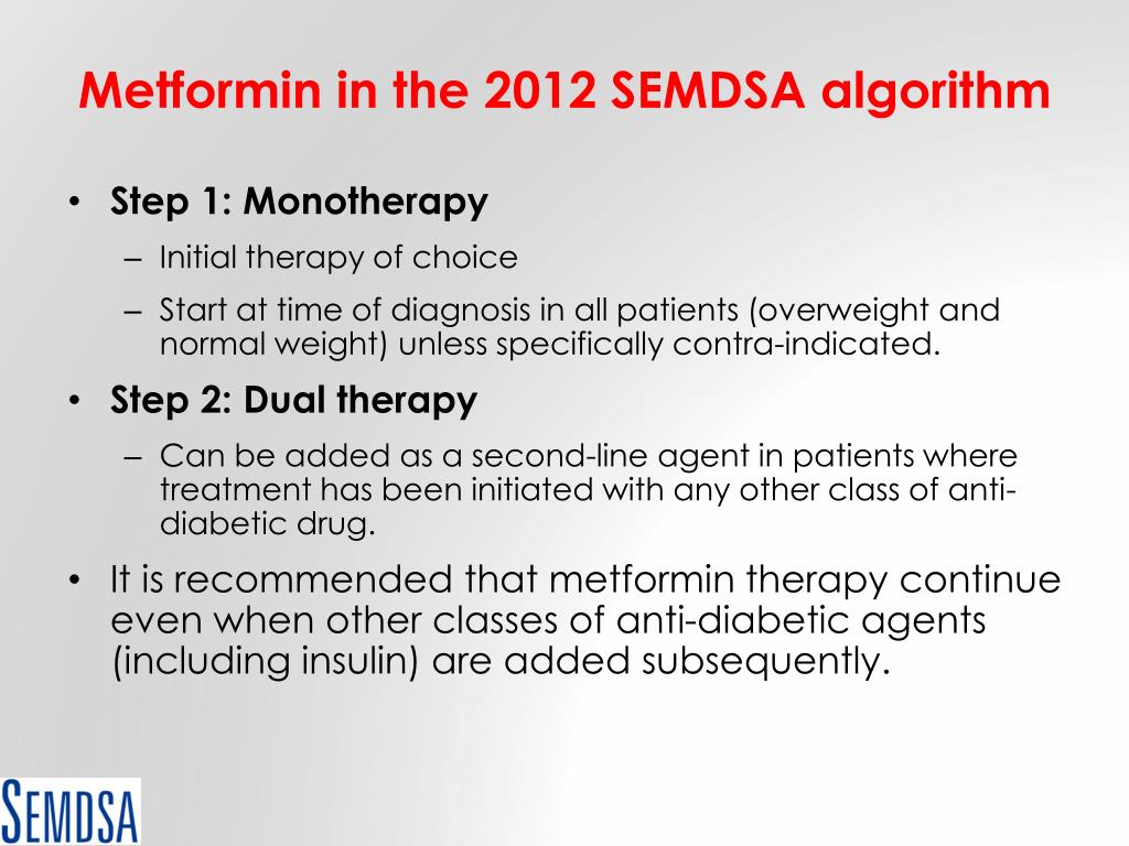 Metformin in the 2012 SEMDSA algorithm • Step 1: Monotherapy • Initial therapy of choice • Start at time of diagnosis in all patients (overweight and normal weight) unless specifically contra-indicated. • Step 2: Dual therapy • Can be added as a second-line agent in patients where treatment has been initiated with any other class of anti-diabetic drug. • It is recommended that metformin therapy continue even when other classes of anti-diabetic agents (including insulin) are added subsequently.