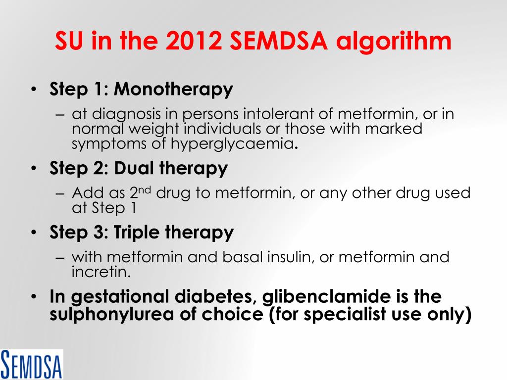 SU in the 2012 SEMDSA algorithm • Step 1: Monotherapy • at diagnosis in persons intolerant of metformin, or in normal weight individuals or those with marked symptoms of hyperglycaemia. • Step 2: Dual therapy • Add as 2nd drug to metformin, or any other drug used at Step 1 • Step 3: Triple therapy • with metformin and basal insulin, or metformin and incretin. • In gestational diabetes, glibenclamide is the sulphonylurea of choice (for specialist use only)