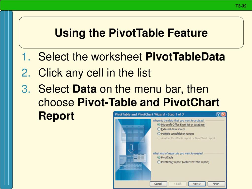 Using the PivotTable Feature • Select the worksheet PivotTableData • Click any cell in the list • Select Data on the menu bar, then choose Pivot-Table and PivotChart Report