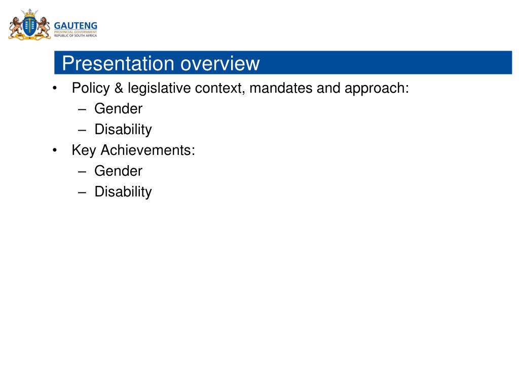 Presentation overview • Policy & legislative context, mandates and approach: • Gender • Disability • Key Achievements: • Gender • Disability
