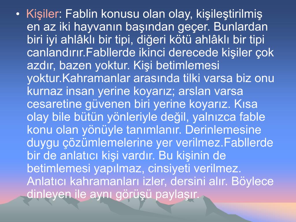 14. Fabllar insan belleğinde çok kolay saklanabilen ve ortaya çıkarılabilen özelliklere sahip olduğu için sözlü gelenek içinde de yaşatılabilmektedir. • 15. Bütün uluslarda ortak bir nitelikte olan fabllar basit, pratik ahlâk ilkeleridir.