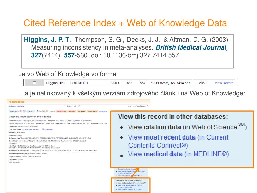 Cited Reference Index + Web of Knowledge Data Higgins, J. P. T., Thompson, S. G., Deeks, J. J., & Altman, D. G. (2003). Measuring inconsistency in meta-analyses. British Medical Journal, 327(7414), 557-560. doi: 10.1136/bmj.327.7414.557 Je vo Web of Knowledge vo forme …a je nalinkovaný k všetkým verziám zdrojového článku na Web of Knowledge: