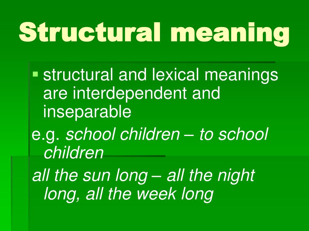Structural meaning • structural and lexical meanings are interdependent and inseparable e.g. school children – to school children all the sun long – all the night long, all the week long