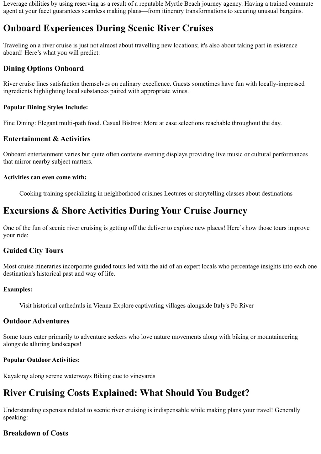 Leverage abilities by using reserving as a result of a reputable Myrtle Beach journey agency. Having a trained commute agent at your facet guarantees seamless making plans—from itinerary transformations to securing unusual bargains. Onboard Experiences During Scenic River Cruises Traveling on a river cruise is just not almost about travelling new locations; it's also about taking part in existence aboard! Here’s what you will predict: Dining Options Onboard River cruise lines satisfaction themselves on culinary excellence. Guests sometimes have fun with locally-impressed ingredients highlighting local substances paired with appropriate wines. Popular Dining Styles Include: Fine Dining: Elegant multi-path food. Casual Bistros: More at ease selections reachable throughout the day. Entertainment & Activities Onboard entertainment varies but quite often contains evening displays providing live music or cultural performances that mirror nearby subject matters. Activities can even come with: Cooking training specializing in neighborhood cuisines Lectures or storytelling classes about destinations Excursions & Shore Activities During Your Cruise Journey One of the fun of scenic river cruising is getting off the deliver to explore new places! Here’s how those tours improve your ride: Guided City Tours Most cruise itineraries incorporate guided tours led with the aid of an expert locals who percentage insights into each one destination's historical past and way of life. Examples: Visit historical cathedrals in Vienna Explore captivating villages alongside Italy's Po River Outdoor Adventures Some tours cater primarily to adventure seekers who love nature movements along with biking or mountaineering alongside alluring landscapes! Popular Outdoor Activities: Kayaking along serene waterways Biking due to vineyards River Cruising Costs Explained: What Should You Budget? Understanding expenses related to scenic river cruising is indispensable while making plans your travel! Generally speaking: Breakdown of Costs
