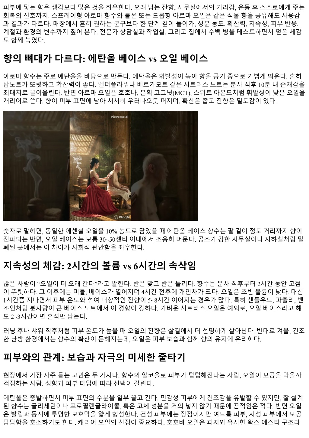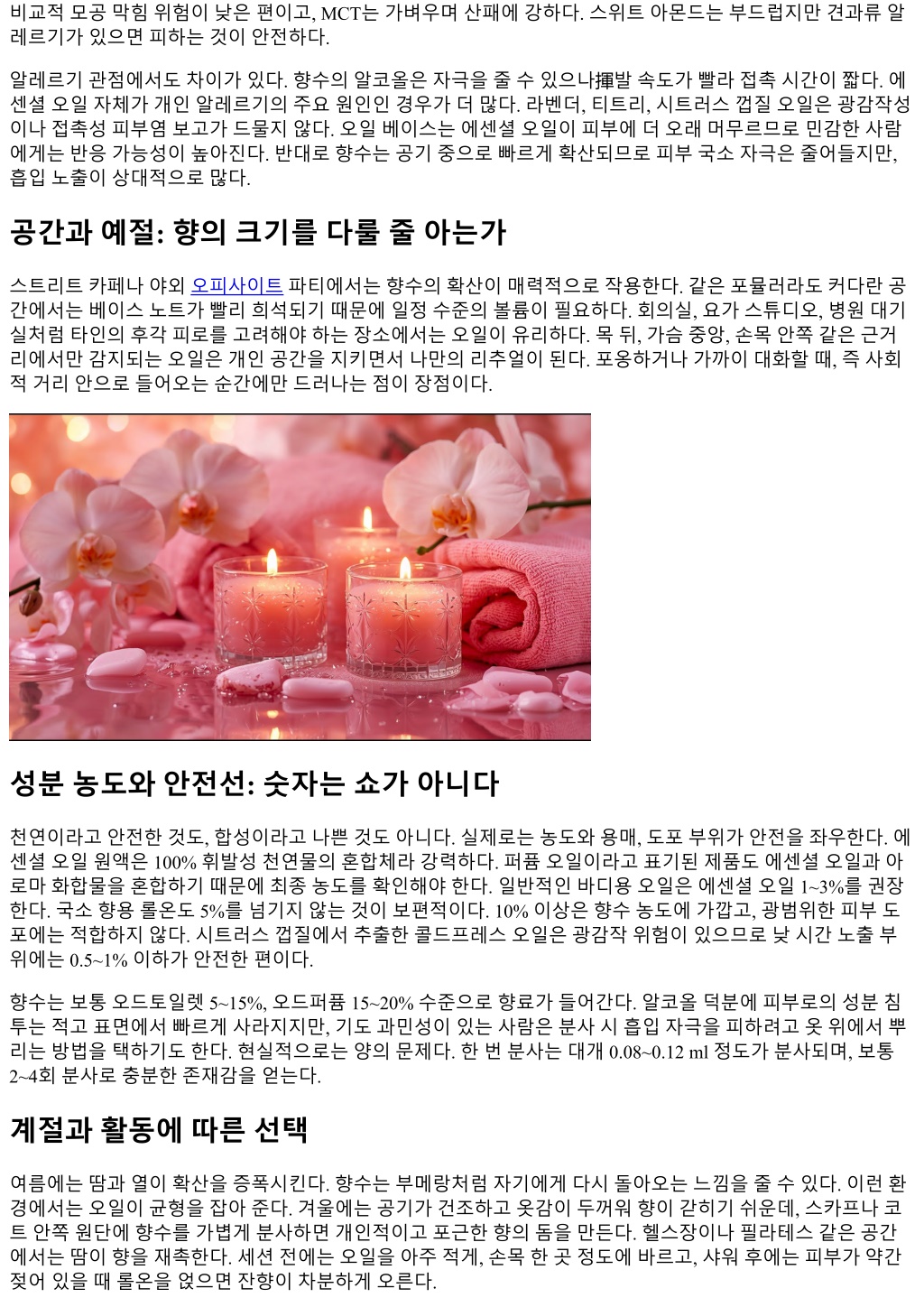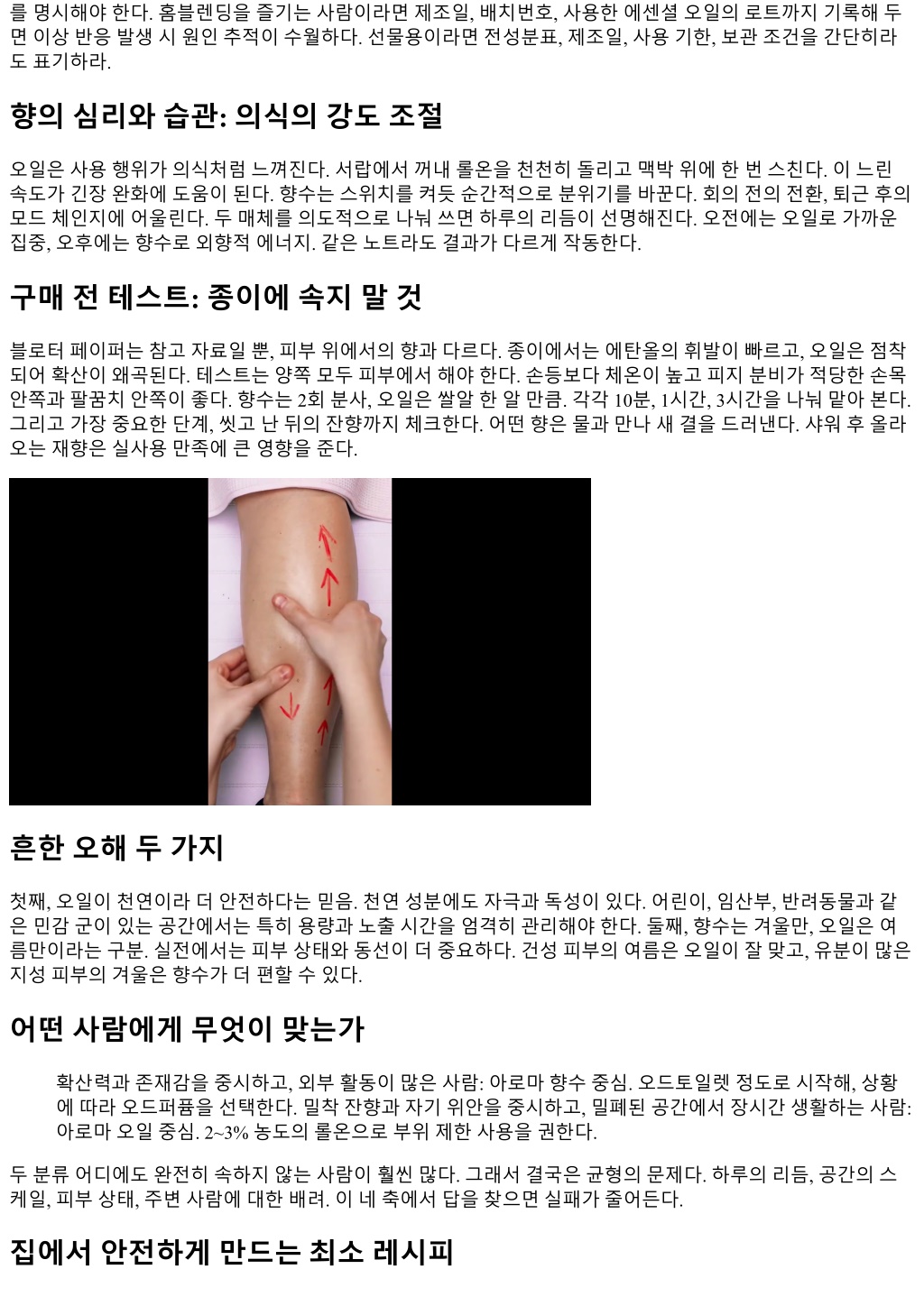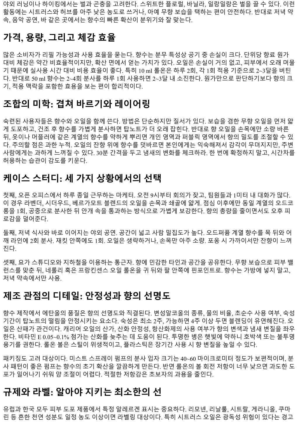 를명시해야한다. 홈블렌딩을즐기는사람이라면제조일, 배치번호, 사용한에센셜오일의로트까지기록해두 면이상반응발생시원인추적이수월하다. 선물용이라면전성분표, 제조일, 사용기한, 보관조건을간단히라 도표기하라. 향의심리와습관: 의식의강도조절 오일은사용행위가의식처럼느껴진다. 서랍에서꺼내롤온을천천히돌리고맥박위에한번스친다. 이느린 속도가긴장완화에도움이된다. 향수는스위치를켜듯순간적으로분위기를바꾼다. 회의전의전환, 퇴근후의 모드체인지에어울린다. 두매체를의도적으로나눠쓰면하루의리듬이선명해진다. 오전에는오일로가까운 집중, 오후에는향수로외향적에너지. 같은노트라도결과가다르게작동한다. 구매전테스트: 종이에속지말것 블로터페이퍼는참고자료일뿐, 피부위에서의향과다르다. 종이에서는에탄올의휘발이빠르고, 오일은점착 되어확산이왜곡된다. 테스트는양쪽모두피부에서해야한다. 손등보다체온이높고피지분비가적당한손목 안쪽과팔꿈치안쪽이좋다. 향수는 2회분사, 오일은쌀알한알만큼. 각각 10분, 1시간, 3시간을나눠맡아본다. 그리고가장중요한단계, 씻고난뒤의잔향까지체크한다. 어떤향은물과만나새결을드러낸다. 샤워후올라 오는재향은실사용만족에큰영향을준다. 흔한오해두가지 첫째, 오일이천연이라더안전하다는믿음. 천연성분에도자극과독성이있다. 어린이, 임산부, 반려동물과같 은민감군이있는공간에서는특히용량과노출시간을엄격히관리해야한다. 둘째, 향수는겨울만, 오일은여 름만이라는구분. 실전에서는피부상태와동선이더중요하다. 건성피부의여름은오일이잘맞고, 유분이많은 지성피부의겨울은향수가더편할수있다. 어떤사람에게무엇이맞는가 확산력과존재감을중시하고, 외부활동이많은사람: 아로마향수중심. 오드토일렛정도로시작해, 상황 에따라오드퍼퓸을선택한다. 밀착잔향과자기위안을중시하고, 밀폐된공간에서장시간생활하는사람: 아로마오일중심. 2~3% 농도의롤온으로부위제한사용을권한다. 두분류어디에도완전히속하지않는사람이훨씬많다. 그래서결국은균형의문제다. 하루의리듬, 공간의스 케일, 피부상태, 주변사람에대한배려. 이네축에서답을찾으면실패가줄어든다. 집에서안전하게만드는최소레시피