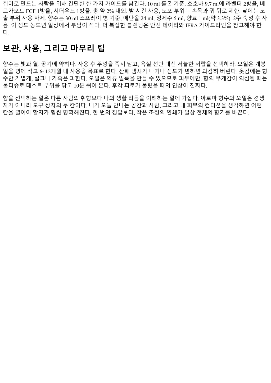 취미로만드는사람을위해간단한한가지가이드를남긴다. 10 ml 롤온기준, 호호바 9.7 ml에라벤더 2방울, 베 르가모트 FCF 1방울, 시더우드 1방울. 총약 2% 내외. 밤시간사용, 도포부위는손목과귀뒤로제한. 낮에는노 출부위사용자제. 향수는 30 ml 스프레이병기준, 에탄올 24 ml, 정제수 5 ml, 향료 1 ml(약 3.3%). 2주숙성후사 용. 이정도농도면일상에서부담이적다. 더복잡한블렌딩은안전데이터와 IFRA 가이드라인을참고해야한 다. 보관, 사용, 그리고마무리팁 향수는빛과열, 공기에약하다. 사용후뚜껑을즉시닫고, 욕실선반대신서늘한서랍을선택하라. 오일은개봉 일을병에적고 6~12개월내사용을목표로한다. 산패냄새가나거나점도가변하면과감히버린다. 옷감에는향 수만가볍게, 실크나가죽은피한다. 오일은의류얼룩을만들수있으므로피부에만. 향의무게감이의심될때는 물티슈로테스트부위를닦고 10분쉬어본다. 후각피로가풀렸을때의인상이진짜다. 향을선택하는일은다른사람의취향보다나의생활리듬을이해하는일에가깝다. 아로마향수와오일은경쟁 자가아니라도구상자의두칸이다. 내가오늘만나는공간과사람, 그리고내피부의컨디션을생각하면어떤 칸을열어야할지가훨씬명확해진다. 한번의정답보다, 작은조정의연쇄가일상전체의향기를바꾼다.