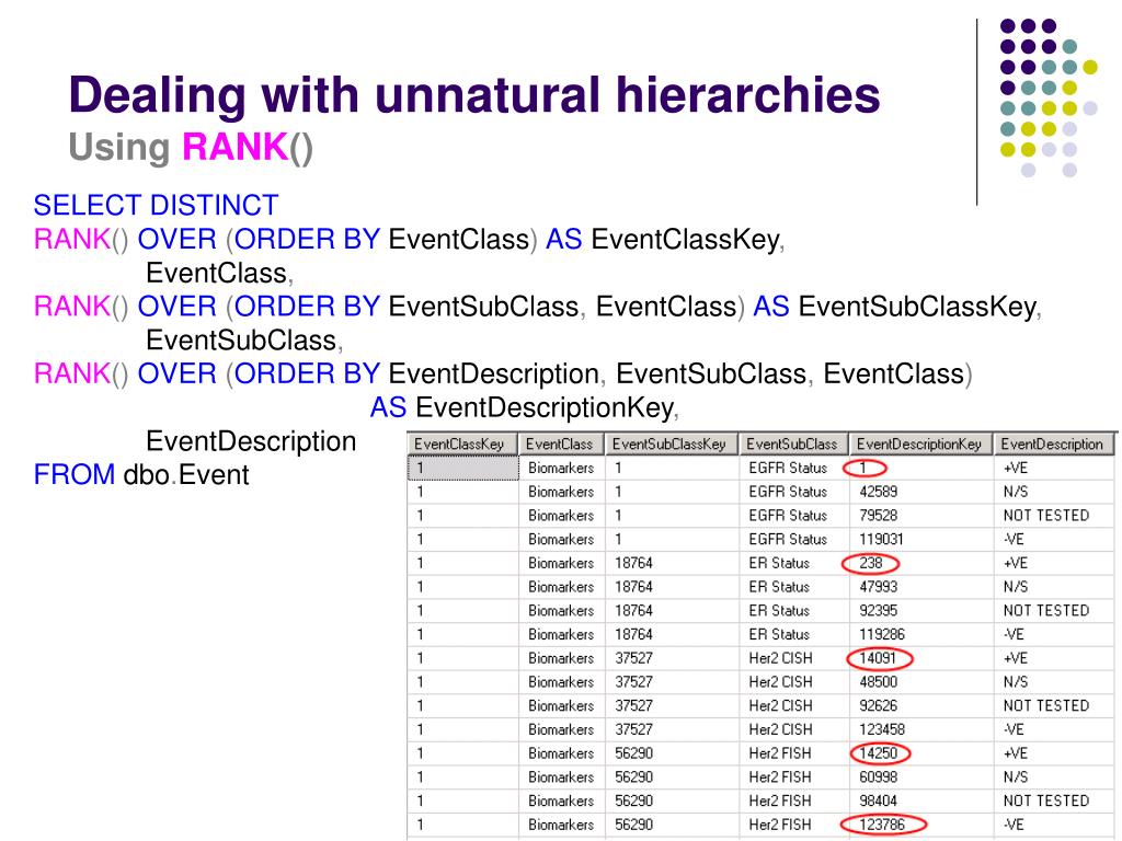 Dealing with unnatural hierarchiesUsingRANK() SELECTDISTINCT RANK()OVER (ORDERBYEventClass)ASEventClassKey, EventClass, RANK()OVER (ORDERBYEventSubClass,EventClass)ASEventSubClassKey, EventSubClass, RANK()OVER (ORDERBYEventDescription,EventSubClass,EventClass) ASEventDescriptionKey, EventDescription FROMdbo.Event