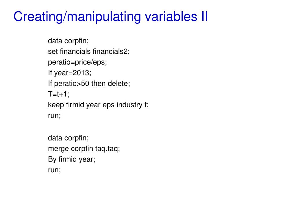 Creating/manipulating variables II data corpfin; set financials financials2; peratio=price/eps; If year=2013; If peratio>50 then delete; T=t+1; keep firmid year epsindustry t; run; data corpfin; merge corpfintaq.taq; By firmid year; run;