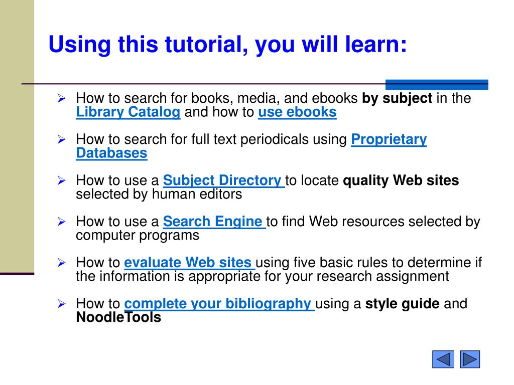 Using this tutorial, you will learn: • How to search for books, media, and ebooksby subjectin theLibrary Catalogand how to use ebooks • How to search for full text periodicals usingProprietary Databases • How to use aSubject Directorytolocate quality Web sites selected by human editors • How to use aSearch Engineto find Web resources selected by computer programs • How to evaluate Web sitesusing five basic rules to determine if the information is appropriate for your research assignment • How to complete your bibliographyusing astyle guideandNoodleTools