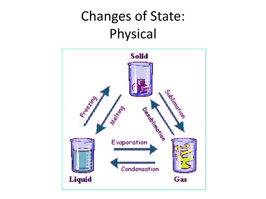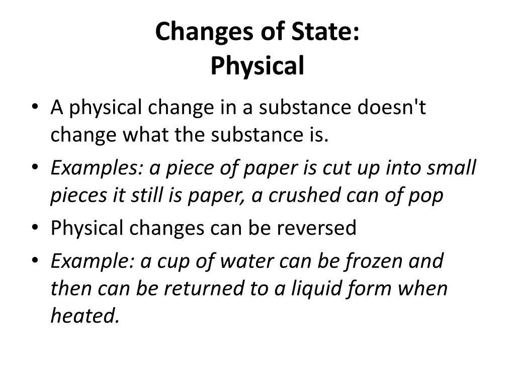 Changes of State:Physical • A physical change in a substance doesn't change what the substance is. • Examples: a piece of paper is cut up into small pieces it still is paper, a crushed can of pop • Physical changes can be reversed • Example: a cup of water can be frozen and then can be returned to a liquid form when heated.