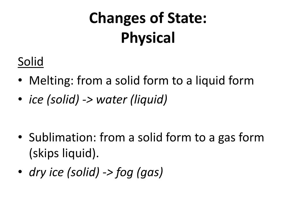 Changes of State:Physical Solid • Melting: from a solid form to a liquid form • ice (solid) -> water (liquid) • Sublimation: from a solid form to a gas form (skips liquid). • dry ice (solid) -> fog (gas)