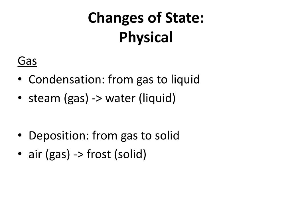 Changes of State:Physical Gas • Condensation: from gas to liquid • steam (gas) -> water (liquid) • Deposition: from gas to solid • air (gas) -> frost (solid)