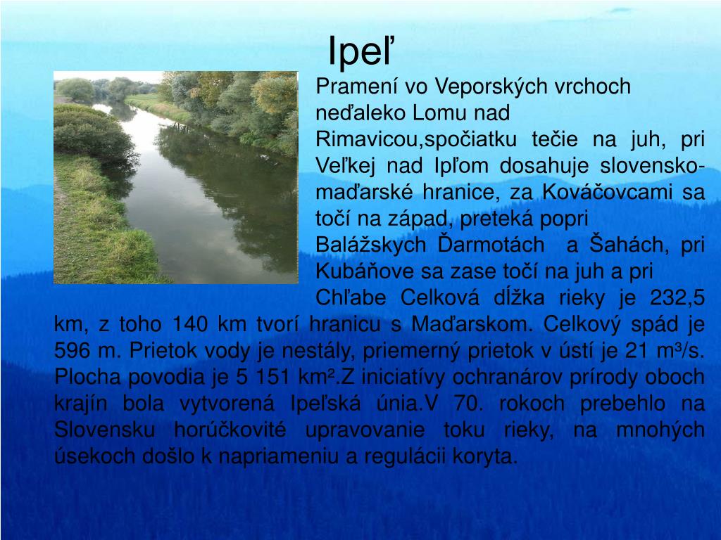 Ipeľ Pramení vo Veporských vrchoch neďaleko Lomu nad Rimavicou,spočiatku tečie na juh, pri Veľkej nad Ipľom dosahuje slovensko- maďarské hranice, za Kováčovcami sa točí na západ, preteká popri Balážskych Ďarmotách a Šahách, pri Kubáňove sa zase točí na juh a pri Chľabe Celková dĺžka rieky je 232,5 km, z toho 140 km tvorí hranicu s Maďarskom. Celkový spád je 596 m. Prietok vody je nestály, priemerný prietok v ústí je 21 m³/s. Plocha povodia je 5 151 km².Z iniciatívy ochranárov prírody oboch krajín bola vytvorená Ipeľská únia.V 70. rokoch prebehlo na Slovensku horúčkovité upravovanie toku rieky, na mnohých úsekoch došlo k napriameniu a regulácii koryta.
