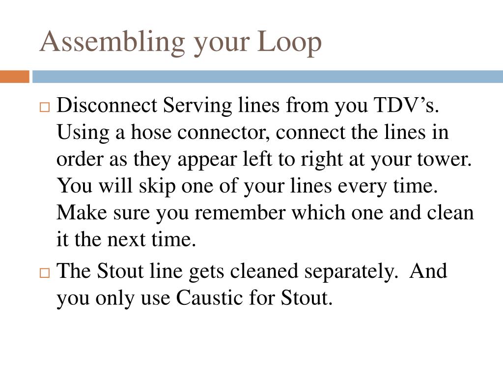 Assembling your Loop • Disconnect Serving lines from you TDV’s. Using a hose connector, connect the lines in order as they appear left to right at your tower. You will skip one of your lines every time. Make sure you remember which one and clean it the next time. • The Stout line gets cleaned separately. And you only use Caustic for Stout.