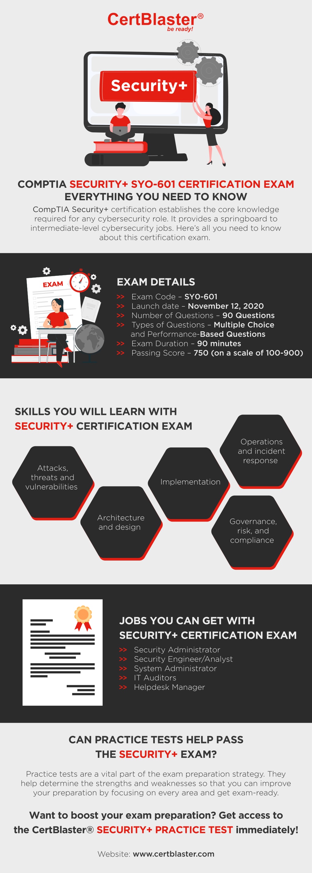 Security+ COMPTIA SECURITY+ SYO-601 CERTIFICATION EXAM EVERYTHING YOU NEED TO KNOW CompTIA Security+ certification establishes the core knowledge required for any cybersecurity role. It provides a springboard to intermediate-level cybersecurity jobs. Here’s all you need to know about this certification exam. EXAM DETAILS >>Exam Code – SY0-601 >>Launch date – November 12, 2020 >>Number of Questions – 90 Questions >>Types of Questions – Multiple Choice and Performance-Based Questions >>Exam Duration – 90 minutes >>Passing Score – 750 (on a scale of 100-900) SKILLS YOU WILL LEARN WITH https://www.certblaster.com/product/security-practice-test-sy0-601/ SECURITY+ CERTIFICATION EXAM Operations and incident response Attacks, threats and vulnerabilities Implementation Architecture and design Governance, risk, and compliance JOBS YOU CAN GET WITH SECURITY+ CERTIFICATION EXAM >>Security Administrator >>Security Engineer/Analyst >>System Administrator >>IT Auditors >>Helpdesk Manager CAN PRACTICE TESTS HELP PASS https://www.certblaster.com/product/security-practice-test-sy0-601/ THE SECURITY+ EXAM? Practice tests are a vital part of the exam preparation strategy. They help determine the strengths and weaknesses so that you can improve your preparation by focusing on every area and get exam-ready. Want to boost your exam preparation? Get access to https://www.certblaster.com/product/security-practice-test-sy0-601/ the CertBlaster® SECURITY+ PRACTICE TEST immediately! https://www.certblaster.com/security-plus-sy0-601-practice-test/ Website: www.certblaster.com