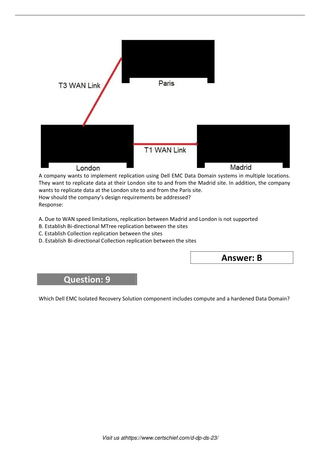 A company wants to implement replication using Dell EMC Data Domain systems in multiple locations. They want to replicate data at their London site to and from the Madrid site. In addition, the company wants to replicate data at the London site to and from the Paris site. How should the company’s design requirements be addressed? Response: A. Due to WAN speed limitations, replication between Madrid and London is not supported B. Establish Bi-directional MTree replication between the sites C. Establish Collection replication between the sites D. Establish Bi-directional Collection replication between the sites Answer: B Question: 9 Which Dell EMC Isolated Recovery Solution component includes compute and a hardened Data Domain? Visit us athttps://www.certschief.com/d-dp-ds-23/