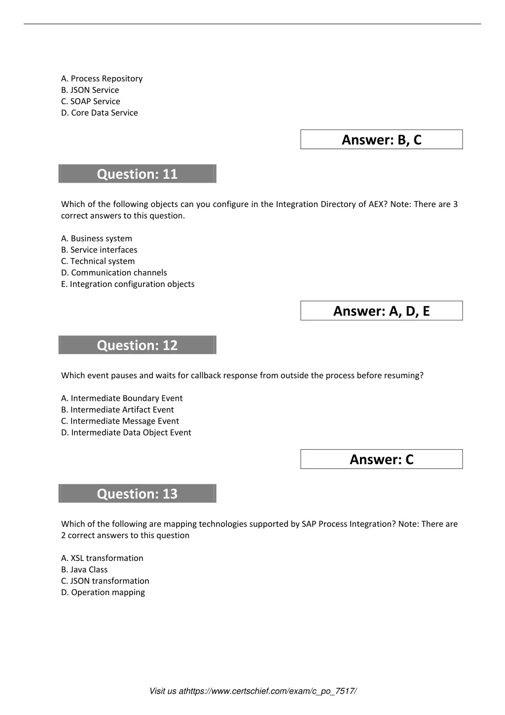 A. Process Repository B. JSON Service C. SOAP Service D. Core Data Service Answer: B, C Question: 11 Which of the following objects can you configure in the Integration Directory of AEX? Note: There are 3 correct answers to this question. A. Business system B. Service interfaces C. Technical system D. Communication channels E. Integration configuration objects Answer: A, D, E Question: 12 Which event pauses and waits for callback response from outside the process before resuming? A. Intermediate Boundary Event B. Intermediate Artifact Event C. Intermediate Message Event D. Intermediate Data Object Event Answer: C Question: 13 Which of the following are mapping technologies supported by SAP Process Integration? Note: There are 2 correct answers to this question A. XSL transformation B. Java Class C. JSON transformation D. Operation mapping Visit us athttps://www.certschief.com/exam/c_po_7517/