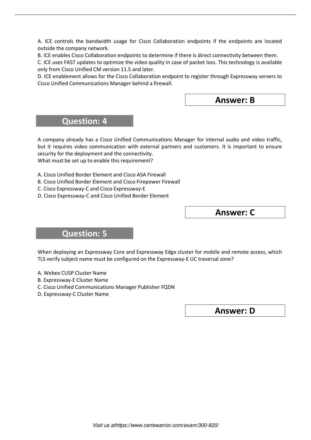 A. ICE controls the bandwidth usage for Cisco Collaboration endpoints if the endpoints are located outside the company network. B. ICE enables Cisco Collaboration endpoints to determine if there is direct connectivity between them. C. ICE uses FAST updates to optimize the video quality in case of packet loss. This technology is available only from Cisco Unified CM version 11.5 and later. D. ICE enablement allows for the Cisco Collaboration endpoint to register through Expressway servers to Cisco Unified Communications Manager behind a firewall. Answer: B Question: 4 A company already has a Cisco Unified Communications Manager for internal audio and video traffic, but it requires video communication with external partners and customers. It is important to ensure security for the deployment and the connectivity. What must be set up to enable this requirement? A. Cisco Unified Border Element and Cisco ASA Firewall B. Cisco Unified Border Element and Cisco Firepower Firewall C. Cisco Expressway-C and Cisco Expressway-E D. Cisco Expressway-C and Cisco Unified Border Element Answer: C Question: 5 When deploying an Expressway Core and Expressway Edge cluster for mobile and remote access, which TLS verify subject name must be configured on the Expressway-E UC traversal zone? A. Webex CUSP Cluster Name B. Expressway-E Cluster Name C. Cisco Unified Communications Manager Publisher FQDN D. Expressway-C Cluster Name Answer: D Visit us athttps://www.certswarrior.com/exam/300-820/