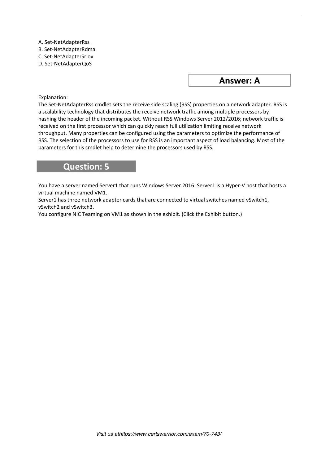 A. Set-NetAdapterRss B. Set-NetAdapterRdma C. Set-NetAdapterSriov D. Set-NetAdapterQoS Answer: A Explanation: The Set-NetAdapterRss cmdlet sets the receive side scaling (RSS) properties on a network adapter. RSS is a scalability technology that distributes the receive network traffic among multiple processors by hashing the header of the incoming packet. Without RSS Windows Server 2012/2016; network traffic is received on the first processor which can quickly reach full utilization limiting receive network throughput. Many properties can be configured using the parameters to optimize the performance of RSS. The selection of the processors to use for RSS is an important aspect of load balancing. Most of the parameters for this cmdlet help to determine the processors used by RSS. Question: 5 You have a server named Server1 that runs Windows Server 2016. Server1 is a Hyper-V host that hosts a virtual machine named VM1. Server1 has three network adapter cards that are connected to virtual switches named vSwitch1, vSwitch2 and vSwitch3. You configure NIC Teaming on VM1 as shown in the exhibit. (Click the Exhibit button.) Visit us athttps://www.certswarrior.com/exam/70-743/
