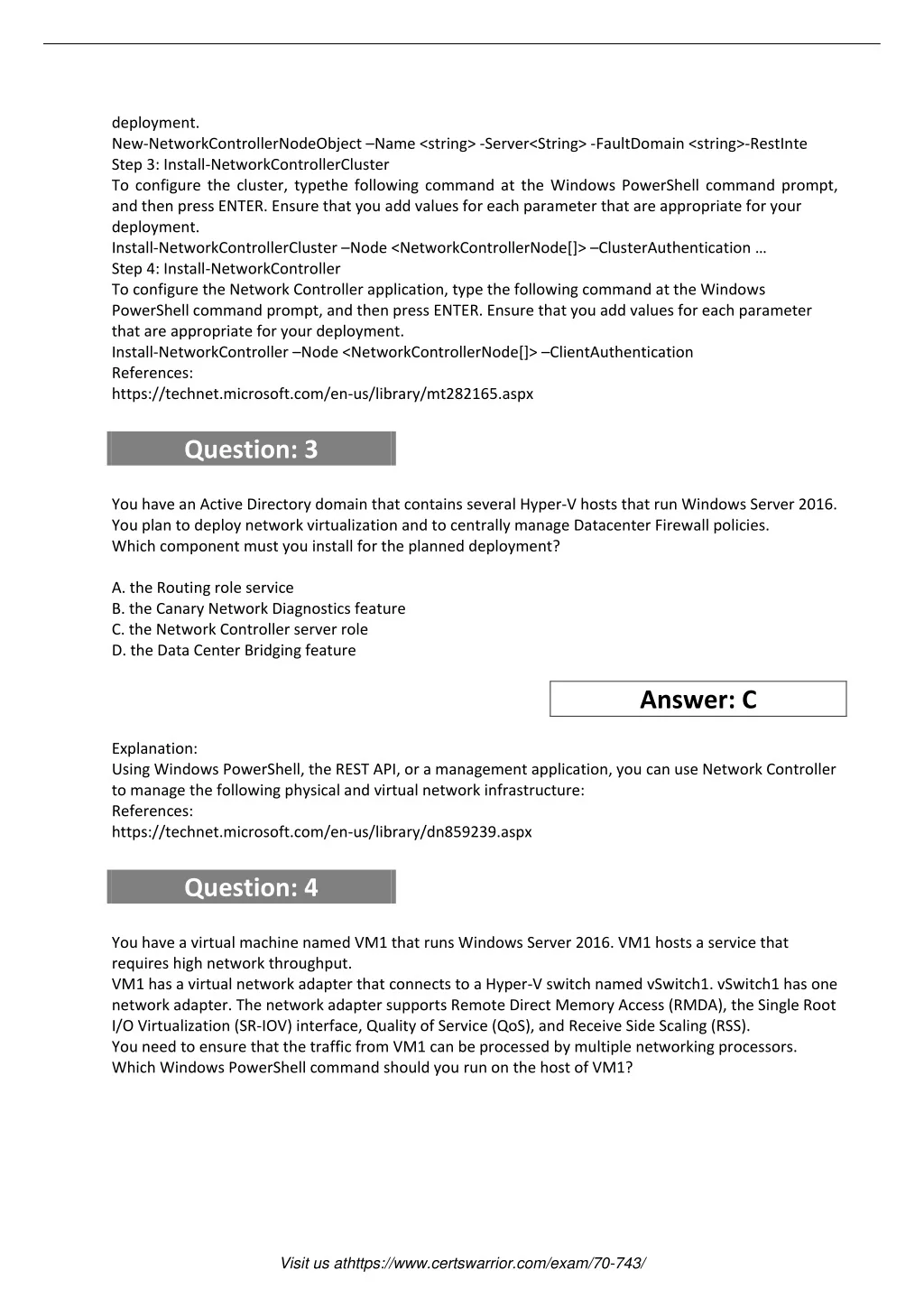 deployment. New-NetworkControllerNodeObject –Name <string> -Server<String> -FaultDomain <string>-RestInte Step 3: Install-NetworkControllerCluster To configure the cluster, typethe following command at the Windows PowerShell command prompt, and then press ENTER. Ensure that you add values for each parameter that are appropriate for your deployment. Install-NetworkControllerCluster –Node <NetworkControllerNode[]> –ClusterAuthentication … Step 4: Install-NetworkController To configure the Network Controller application, type the following command at the Windows PowerShell command prompt, and then press ENTER. Ensure that you add values for each parameter that are appropriate for your deployment. Install-NetworkController –Node <NetworkControllerNode[]> –ClientAuthentication References: https://technet.microsoft.com/en-us/library/mt282165.aspx Question: 3 You have an Active Directory domain that contains several Hyper-V hosts that run Windows Server 2016. You plan to deploy network virtualization and to centrally manage Datacenter Firewall policies. Which component must you install for the planned deployment? A. the Routing role service B. the Canary Network Diagnostics feature C. the Network Controller server role D. the Data Center Bridging feature Answer: C Explanation: Using Windows PowerShell, the REST API, or a management application, you can use Network Controller to manage the following physical and virtual network infrastructure: References: https://technet.microsoft.com/en-us/library/dn859239.aspx Question: 4 You have a virtual machine named VM1 that runs Windows Server 2016. VM1 hosts a service that requires high network throughput. VM1 has a virtual network adapter that connects to a Hyper-V switch named vSwitch1. vSwitch1 has one network adapter. The network adapter supports Remote Direct Memory Access (RMDA), the Single Root I/O Virtualization (SR-IOV) interface, Quality of Service (QoS), and Receive Side Scaling (RSS). You need to ensure that the traffic from VM1 can be processed by multiple networking processors. Which Windows PowerShell command should you run on the host of VM1? Visit us athttps://www.certswarrior.com/exam/70-743/