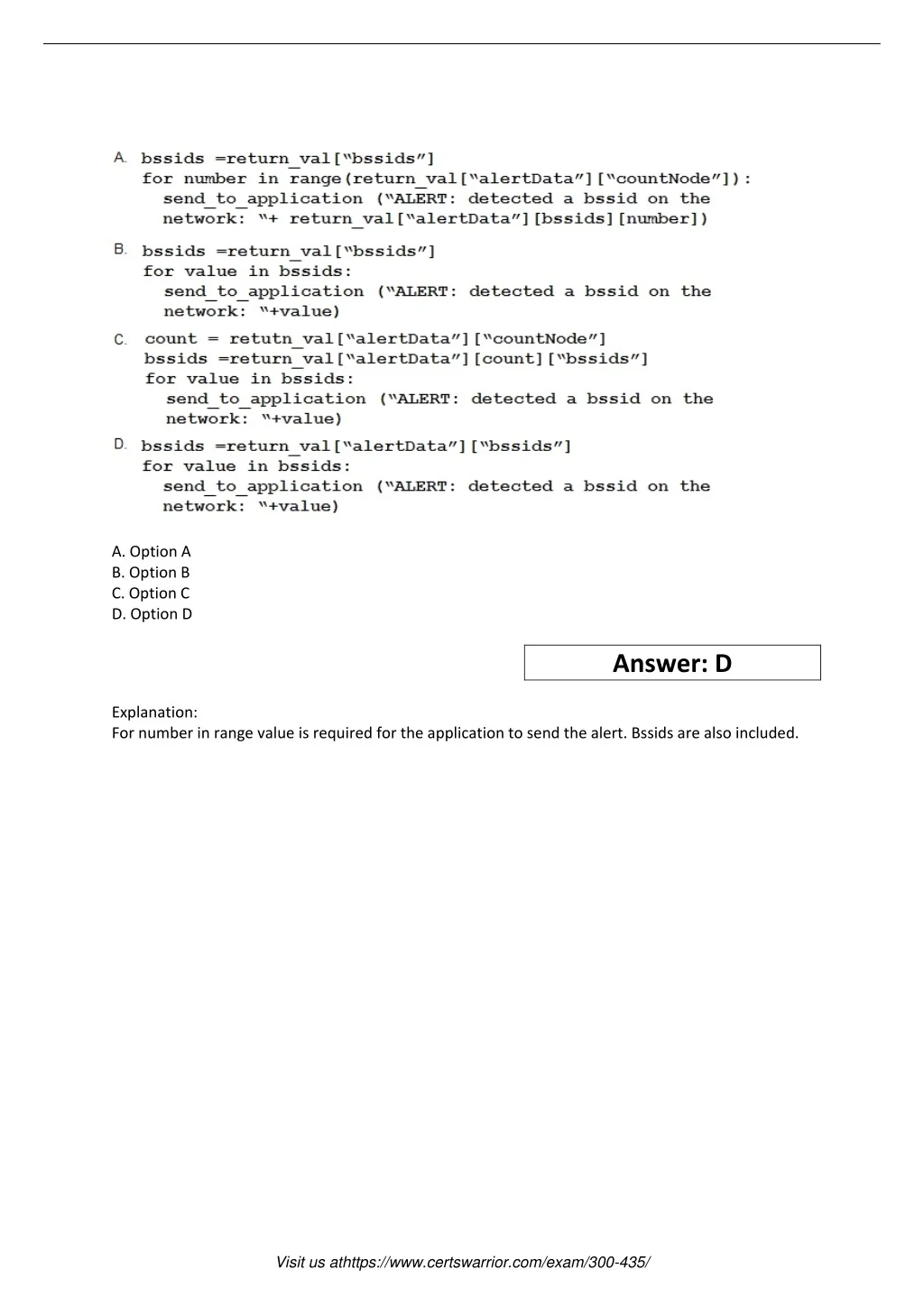A. Option A B. Option B C. Option C D. Option D Answer: D Explanation: For number in range value is required for the application to send the alert. Bssids are also included. Visit us athttps://www.certswarrior.com/exam/300-435/